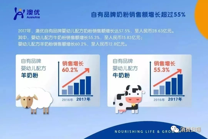 2017年全年,澳优自有品牌婴幼儿牛奶粉和羊奶粉业绩同比增长57.5%至约人民币28.63亿元,为其他客户生产的配方奶粉销售额4.22亿元,奶粉业务总额为32.85亿元。