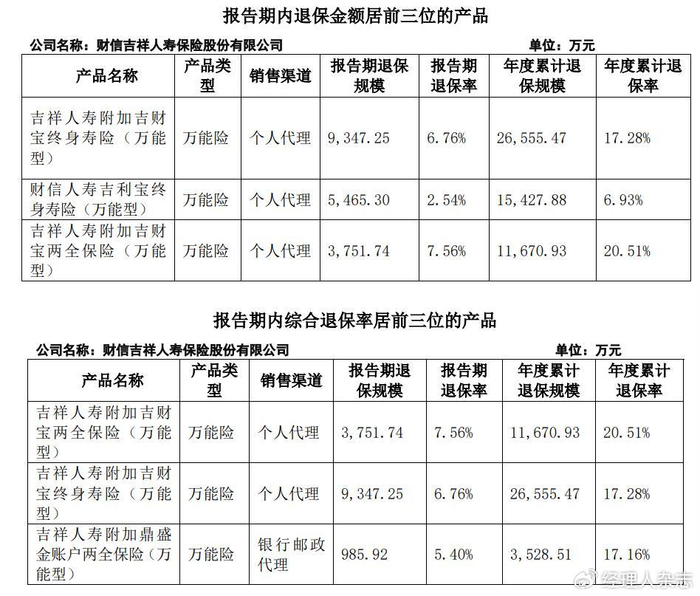 从短期看,财信吉祥人寿的经营稳定性面临考验。一方面,公司早年销售的理财型保险产品正集中进入退保期,2025年前三季度退保金额居前三的产品均为万能险,合计退保金达5.87亿元,对现金流构成持续压力。