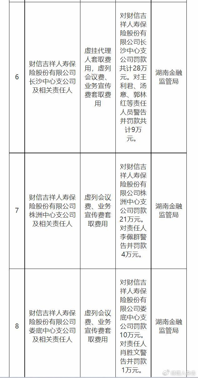 具体而言,还有长沙中心支公司因“虚挂代理人套取费用,虚列会议费、业务宣传费套取费用”,被罚28万元;株洲中心支公司同样因“虚列会议费、业务宣传费套取费用”,被罚21万元;娄底中心支公司同样因“虚列会议费、业务宣传费套取费用”,被罚10万元;永州中心支公司因“虚挂代理人套取费用”,被罚7万元。
