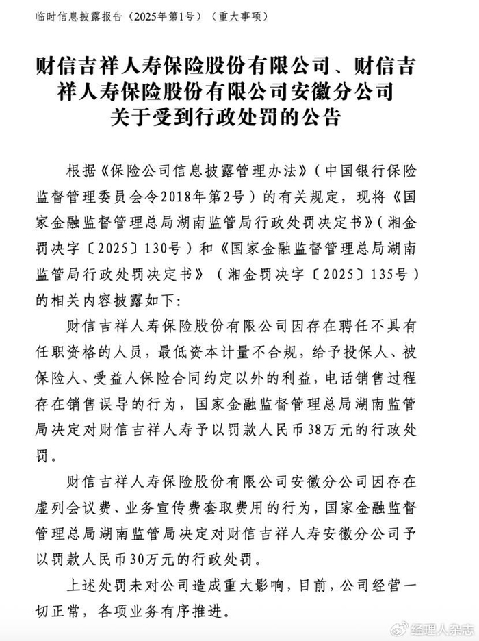 12月10日,财信吉祥人寿在官网发布公告称,公司因存在聘任不具有任职资格的人员,最低资本计量不合规,给予投保人、被保险人、受益人保险合同约定以外的利益,电话销售过程存在销售误导的行为,国家金融监督管理总局湖南监管局决定对其予以罚款38万元的行政处罚。