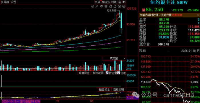 周五国际贵金属大宗商品期货市场可以说血雨腥风,纽约黄金期货价格跌破5000美元,最低见到4700美元;白银更加惨烈,收盘大跌25%,最高118美元,最低74美元,振幅38%,恐慌盘已经涌出。于是,错过本轮贵金属行情的投资人问我,下周一可以抄底了吗?