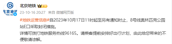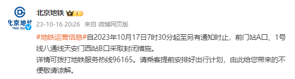 2023年10月17日7时30分起至另有通知时止,北京地铁前门站A口、1号线八通线天安门西站B口采取封闭措施。自2023年10月17日11时起至另有通知时止,8号线奥林匹克公园站E口采取封闭措施。