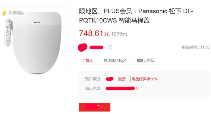 今天我逛张大妈,发现了松下智能马桶盖有好价格,正常价1299元,7月4日最低只要748.61元,一夜暴降550.39元。从这有零有整的价格可以看出,这又是叠卷实现的价格,具体型号是松下DL-PQTK10CWS,但这个智能马桶盖限地区,刚需可以去试试。