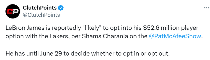 Shams称:“我得到的消息是,他很可能会选择执行选项……这是大概率事件,也是目前的计划。但他的选项截止日期是6月29日(北京时间6月30日),所以他还有大约一个月的时间来做出决定。他和湖人之间将会进行一些艰难的对话,探讨球队未来的阵容架构。因为无论他再打一个赛季还是多个赛季,都希望身处有竞争力的环境中。”