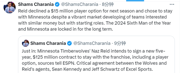 北京时间6月28日,据名记Shams报道,