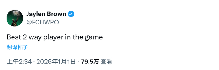 北京时间1月1日,波士顿凯尔特人队球星杰伦-布朗自信地表示,全联盟没有任何一名球员能在攻防两端都与他的影响力相媲美。“联盟最佳攻防一体球员。”布朗在社媒上发文写道,引起球迷们热议。