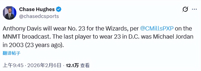 北京时间2月6日,奇才和独行侠的交易官宣,安东尼-戴维斯正式成为一名奇才球员。奇才队记Chase Hughes报道称,浓眉来到奇才将改穿23号球衣,而上一位在奇才穿23号球衣的球员,已经追溯到23年前的迈克尔-乔丹(2003年)。