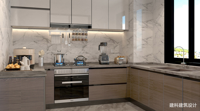 灰白大理石纹理墙+浅木色橱柜,冷调高级感里揉了点温柔烟火气;挂架把锅铲、调料全“上墙”,台面清清爽爽;嵌入式+规整摆放的电器,看着就舒服不杂乱;隐藏氛围灯一打开,下厨都成了治愈系日常,窗边采光还能边做饭边瞟两眼风景。