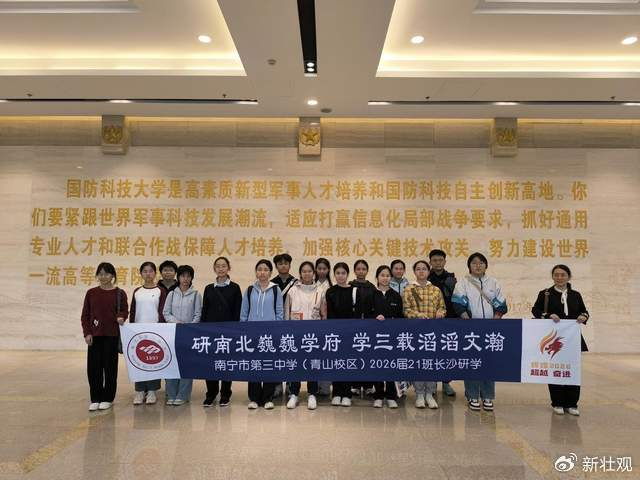 千秋伟业,人才为本。为全面贯彻新时代人才强国战略,努力实现南宁三中培养“家的支柱”“国之栋梁”的育人目标,2024年11月10日,南宁三中2023级21班组织前往两所具有重要意义的高等学府——湖南大学与国防科技大学进行参观学习。此行旨在依托楚湘文化的深厚积淀与国防科技领域的尖端创新,让学生在实践中深切体会中华民族优秀传统文化的博大精深与现代国防科技的强大实力。