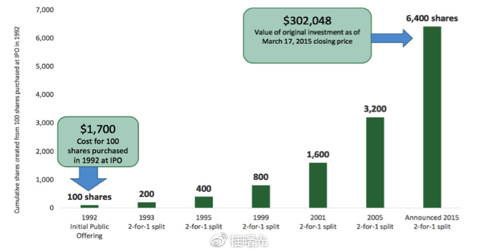 相比于星巴克如今的股价,若1992年6月26日星巴克IPO当天,在星巴克股票上投入1000美元。那么截至2015年10月31日,考虑到六次2:1股票分割和累计现金分红,最初的1000美元投资将价值230,845美元,相当于每年增长率为26.68%。