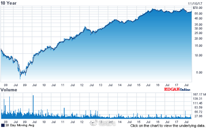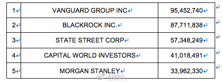 其中机构持股占72.69%,前五大机构持股股东分别为美国先锋集团(Vanguard Group,Inc.)、贝莱德集团(BlackRock,Inc.)、美国道富银行(State Street Corp)、资本世界投资者(Capital World Investors)和摩根士丹利(MorganStanley)。如今星巴克市值近900亿美元,最大的机构持股股东美国先锋集团大约占有55亿美元。
