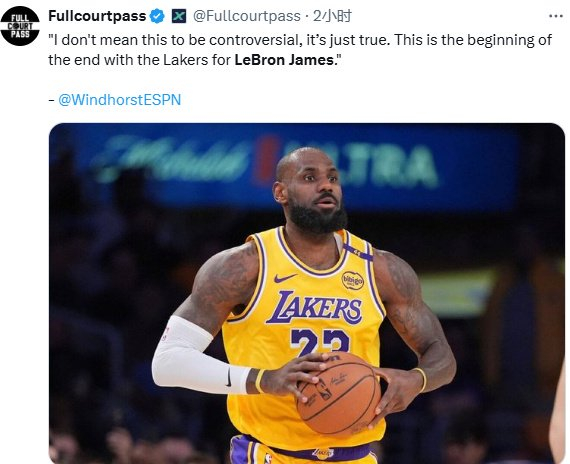 对于詹姆斯的情况,名记Brian Windhorst在节目中表示:我不是故意要引战,这就是事实。詹姆斯的湖人时代将进入倒计时。