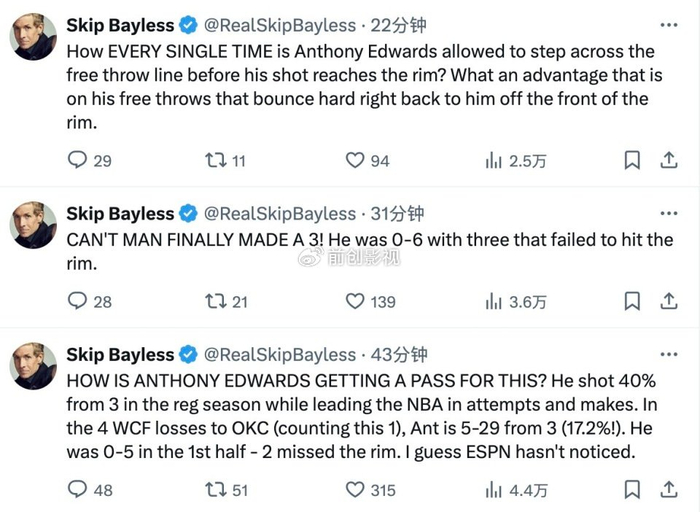 对此,著名评论员Skip在比赛期间忍不住开喷,他表示:“为什么爱德华兹还能逃过批评?常规赛他可是三分命中率40%,命中数和出手数都排联盟第一。可在对雷霆的西决四场失利中(包括这场),他三分29投仅5中,命中率只有17.2%!上半场就5投0中,还有两个直接打铁连框都没碰到。但ESPN似乎还没注意到这一点!”