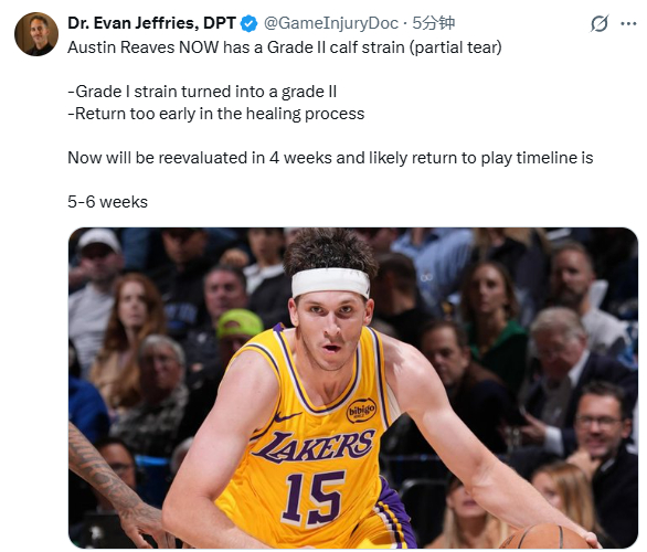 医学专家Evan Jeffries表示,里夫斯遭遇二级小腿拉伤(部分撕裂),由于过早复出,他的小腿一级拉伤升级为二级拉伤,他将在4周后重新评估伤情,可能的复出时间表是5-6周。