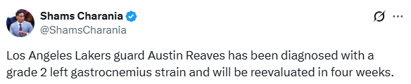 北京时间12月27日,里夫斯的伤情更新,湖人官方宣布,里夫斯左小腿腓肠肌二级拉伤,他将在4周后接受复查,这意味着里夫斯至少伤停四周,对于湖人来说,这真是雪上加霜。