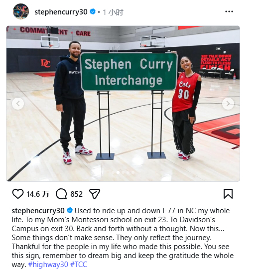 今日勇士赢球赛后,库里在社媒上晒出自己参加母校为他揭牌“斯蒂芬-库里30号站”路牌的画面,配文写道:曾无数次驾车行驶在北卡罗来纳州的I-77公路上,从23号出口去往母亲的蒙台梭利学校,从30号出口抵达戴维森学院的校园,来来回回,从未深想,如今这条路牌……有些事物的意义无法言说,它们只是旅程的注脚。