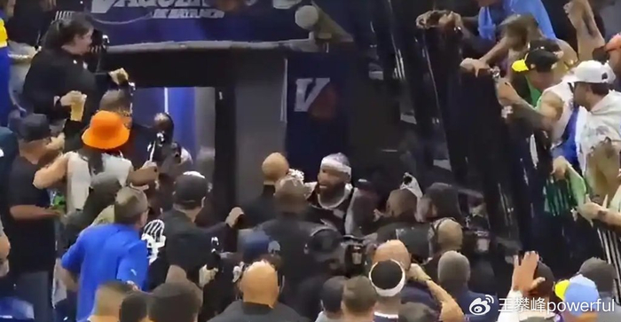 可以看出,美洲球迷的还是民风非常彪悍的。当时考辛斯在球员通道准备出场,没想到跟球迷发生口角之后,饮料像下雨一样泼到他的头上。给他泼饮料的球迷,就像当初奥本山宫殿的阿泰斯特那样。只不过,现场5名保安死死抱住考辛斯,没有让他上头。在考辛斯被保安抱住之后,现场球迷仍然趁机给考辛斯的头上多泼了几次饮料。