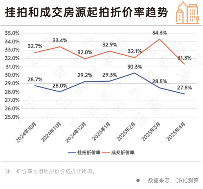 从折价率来看,4月挂拍法拍房平均起拍折价率为27.8%,环比下降0.7个百分点,延续下降之势;成交法拍房平均折价率31.3%,环比下降3.0个百分点,并创下2024年四季度以来新低。