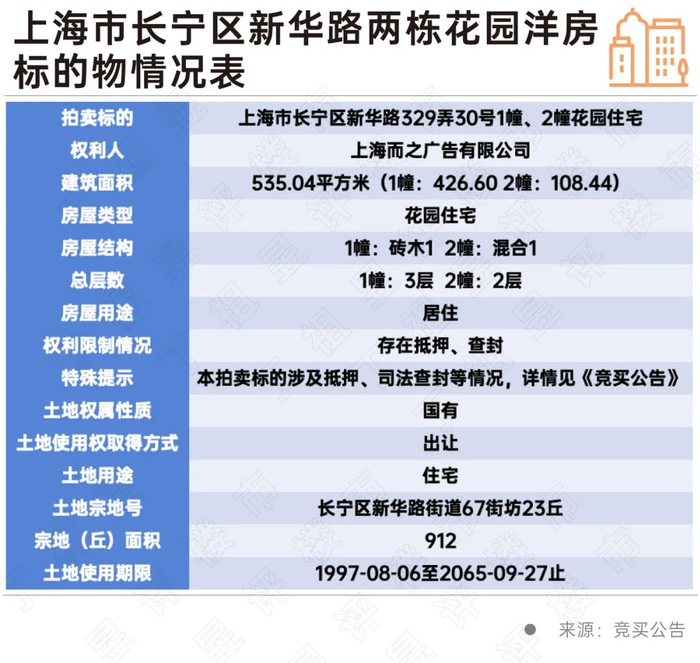 拍卖网站显示,这处法拍房为上海市长宁区新华路329弄30号1幢及2幢花园住宅,房产的总建筑面积为535.04平方米,其中1幢建筑地上三层,建筑面积为426.6平方米,2幢建筑地上两层,建筑面积为108.44平方米。