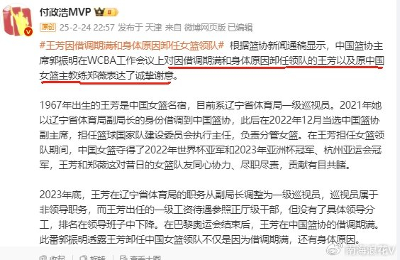 2月24日晚,资深媒体人付政浩通过个人微博透露,中国篮球协会副主席、中国女篮领队王芳借用期已满,中国篮协主席郭振明在WCBA工作会议上对她以及原中国女篮主教练郑薇表达了诚挚谢意。这表明,王芳已经结束在中国女篮为期3年的领队生涯,回到自己的工作单位辽宁省体育局。