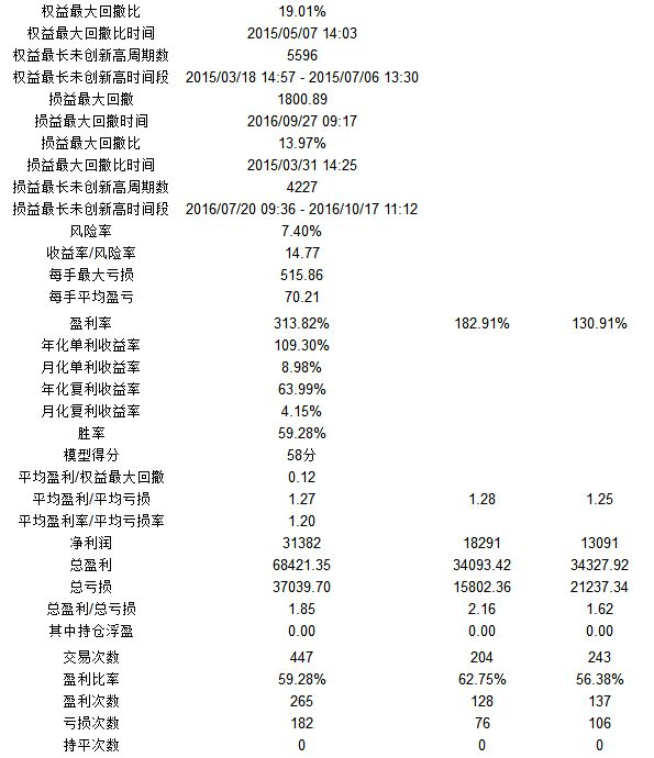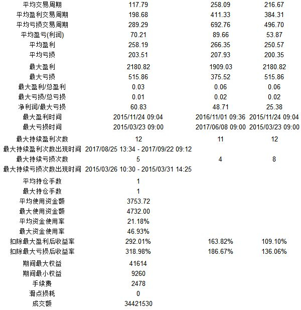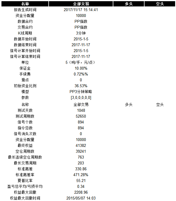 本文中盈利军师策略开发和维护团队的PP3分钟稳健策略,从2015年1月到2017年11月17日回测,单手净利润31382元,年化单利收益率109.3%,当前占用保证金3600元,最大回撤1800元。