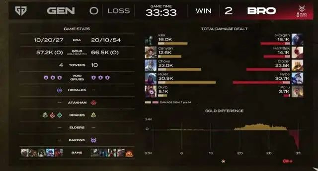 然而意想不到的是,GEN却在今日对阵BRO时爆冷翻车,以0-2惨遭速通,中单Chovy在面对BRO的中单Clozer时表现被全面压制。