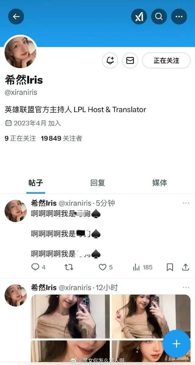 不过这样一位深受LPL观众喜爱的美女主持,却在近日遭遇离谱事件,引起了电竞圈网友的热议。起因是近日有网友发现,国外社交媒体上出现了与希然微博同名的账号,但是上面发布的一些内容却不堪入目。