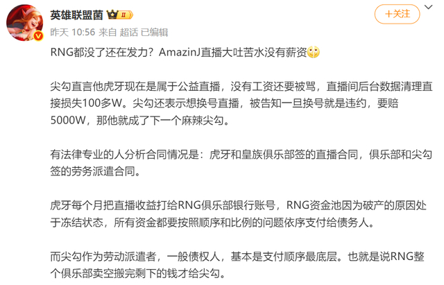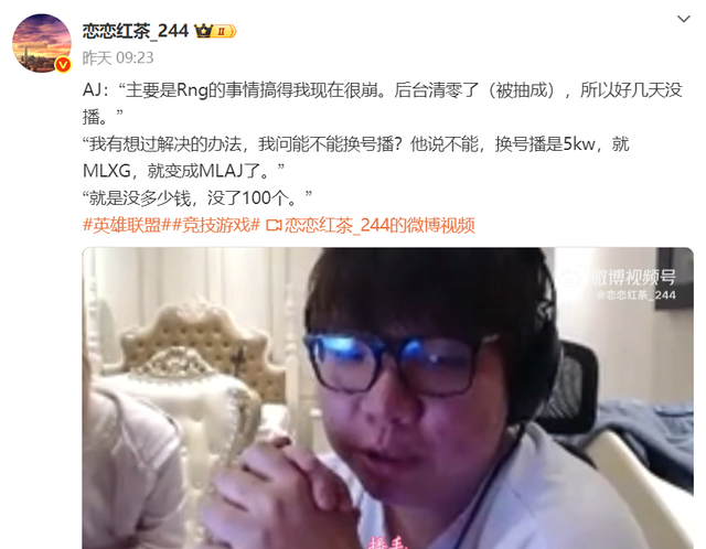 有网友猜测原因可能是RNG身背巨额债务,而AJ和RNG的签约合同条款可能是直播平台将每个月的收益打到RNG的账户。