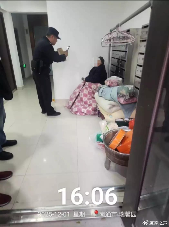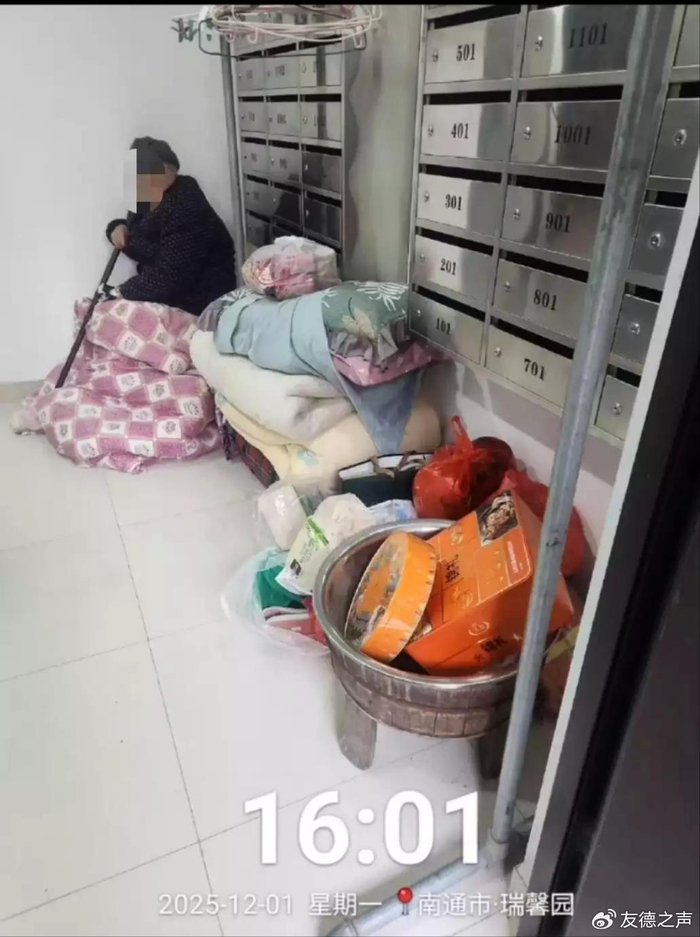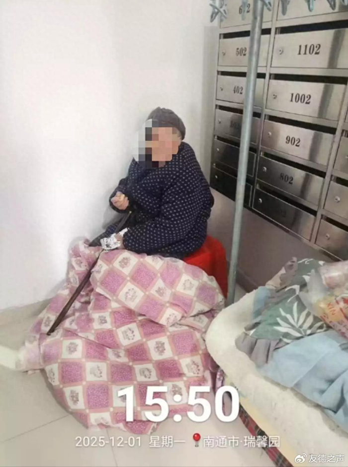 有网友反映,在江苏南通如东县瑞馨园小区内,一位年届94岁的老奶奶竟在楼道里打地铺生活。这一画面被记录下来并发布到网上后,迅速触动了众多网友的心弦。
