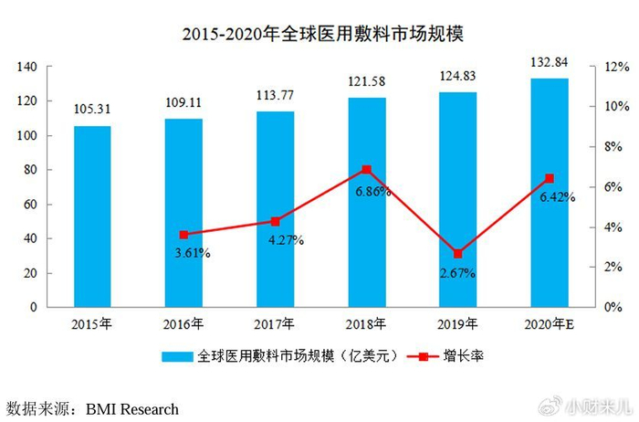 健尔康生产的手术耗材类、伤口护理类、消毒清洁类(除湿巾)以及防护类等产品均属于医用敷料范畴。近年来,全球医用敷料市场规模基本保持稳定增长。根据市场调研机构 BMI Research 的数据,2015-2019 年,全球医用敷料市场规模由 105.31 亿美元增长至124.83 亿美元,预计 2020 年全球医用敷料行业市场规模将达到 132.84 亿美元。