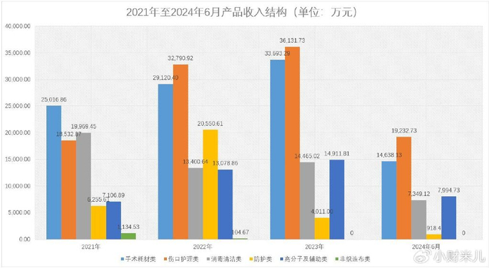 招股书披露,健尔康产品根据使用用途分为手术耗材类、伤口护理类、消毒清洁类、防护类、高分子及辅助类和非织造布类六大系列。其中,伤口护理类占比最高,其次是手术耗材类,两者收入占比近60%,是公司主要收入来源。