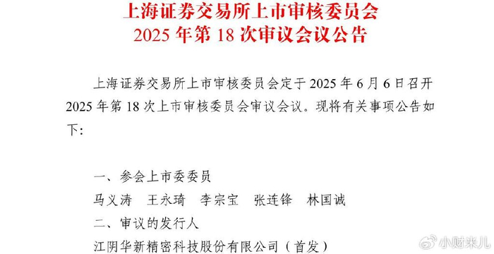 江阴华新精密科技股份有限公司(以下简称华新精科)2023年03月03日开始正式排队上交所主板IPO,已满两年有余。上交所上市审核委员会定于2025年6月6日召开2025 年第18次审议会议,正式审议华新精科的IPO申请。