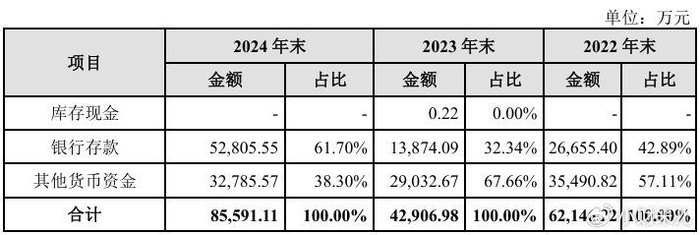另外,道生天合可能还有“存贷双高”的情况。2020年至2024年,公司货币资金余额分别为68,808.13万元、50,622.79万元、62,146.22万元、42,906.98万元、85,591.11万元,其中银行存款分别为48,927.06万元、17,422.73万元、26,655.40万元、13,874.09万元、52,805.55万元,剩余则主要为其他货币资金,即为开具银行承兑汇票而存入银行的保证金。