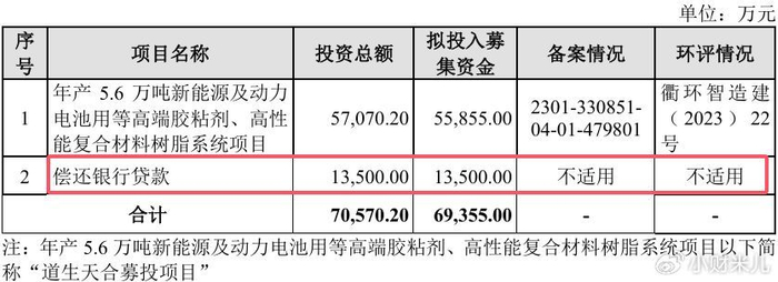 此次IPO,道生天合计划募集资金6.94亿元,用于年产5.6 万吨新能源及动力电池用等高端胶粘剂、高性能复合材料树脂系统项目和偿还银行贷款,其中1.35亿元用于偿还银行贷款。