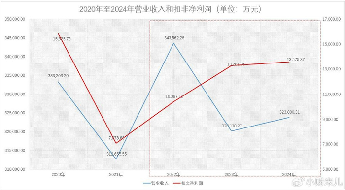 2020年至2024年,道生天合实现营业收入分别为333,203.20万元、312,655.55万元、343,562.26万元、320,170.27万元、323,800.31万元,2021年至2024年同比增长率分别为-6.17%、9.89%、-6.81%、1.13%。同期,公司扣非净利润分别为15,825.73万元、7,078.68万元、10,397.12万元、13,281.05万元、13,575.37万元,2021年至2024年同比增长率分别为-55.27%、46.88%、27.74%、2.22%,公司扣非净利润增长率显著高于营业收入,且增幅显著背离营收趋势。