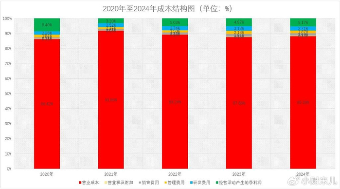 2020年至2024年,道生天合综合毛利率分别为13.58%、8.14%、10.76%、12.34%、11.61%,近三年毛利率仅在两个百分点内变化。与此同时,公司经营活动产生的利润率分别为8.40%、3.10%、5.03%、4.97%、5.17%,波动较小且与营业收入变化趋势一致。公司扣非净利润在收入、毛利率等条件变化并不大的前提下,却实现了高速增长。尤其是2023年,道生天合收入同比下滑,经营活动产生的利润率同比下滑的背景下,扣非净利润同比上涨近27.74%,数据逻辑存疑。