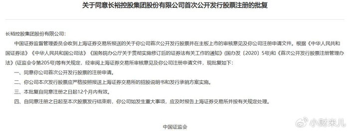 2026年1月09日,证监会网站披露,同意上交所主板企业长裕控股集团股份有限公司的首次公开发行股票注册的批复。