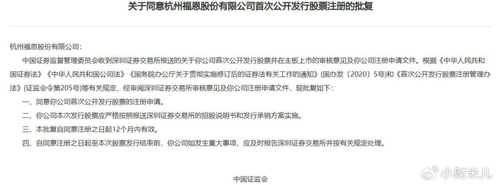 小财米注意到,2026年1月16日,证监会网站披露,同意深交所主板企业杭州福恩股份有限公司的首次公开发行股票注册的批复。