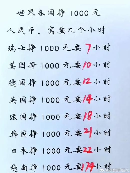 世界各国挣1000元人民币需要多久,瑞士最快,越南最慢需要174小时,中国国内呢?