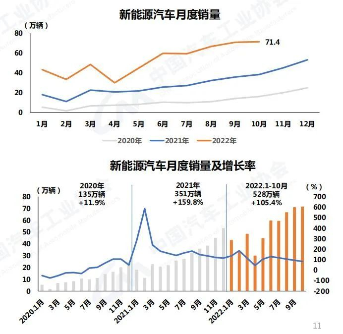 今年1-10月,新能源汽车产销548.5万辆和528万辆,同比均增长1.1倍。在新能源汽车主要品种中,纯电动汽车产销分别完成426.8万辆和411.9万辆,同比增长97.5%和93.1%;插电式混合动力汽车产销分别完成121.5万辆和115.9万辆,同比分别增长1.8倍和1.7倍;燃料电池汽车产销分别完成2700辆和2400辆,同比分别增长1.8倍和1.5倍。