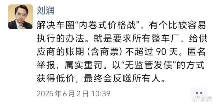 比如,我曾经在朋友圈提了一个小建议:要求企业给上游供应商的账期,不得超过90天。 简单来说,拿到货、接受服务后,90天内必须付款。