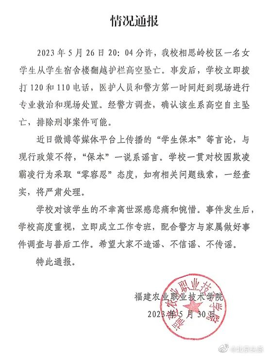 近日,网传消息称,福建农业职业技术学院一19岁女生,疑因遭室友孤立坠楼身亡。事后她的室友被保送本科。5月30日,校方通报:“学生保本”等言论为谣言。
