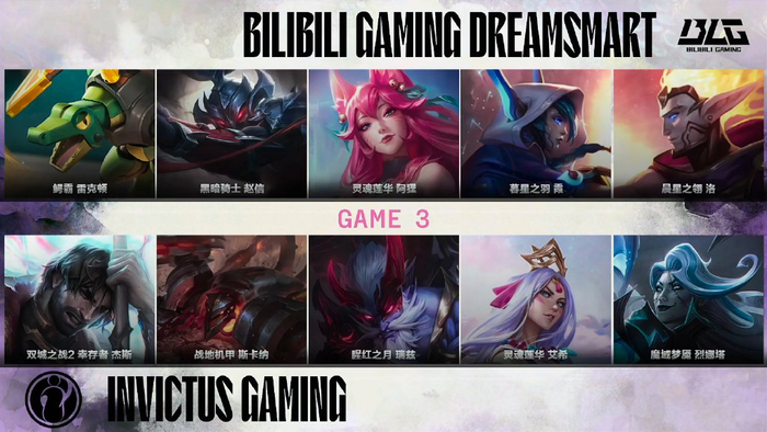 第三局比赛,IG蓝色方,禁用:永恩;格温;卢锡安;婕拉;猪妹,选用:TheShy杰斯;Jiejie蝎子;Rookie瑞兹;GALA寒冰;Meiko烈娜塔;BLG红色方,禁用:蔚;岩雀;韦鲁斯;纳亚菲利;巨魔,选用:Bin鳄鱼;Beichuan赵信;Knight阿狸;Elk霞;ON洛