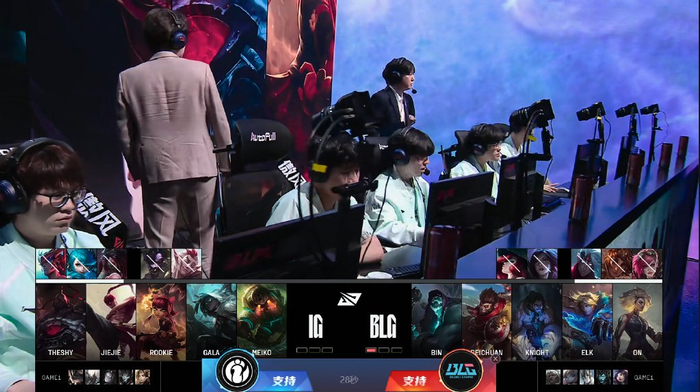 第一局比赛,BLG蓝色方,禁用:韦鲁斯;岩雀;安妮;卡尔玛;寒冰,选用:Bin狼母;Beichuan波比;Knight加里奥;Elk卡莉斯塔;ON妮蔻;IG红色方,禁用:永恩;蔚;格温;阿卡丽;奥恩,选用:TheShy兰博;Jiejie潘森;Rookie发条;GALA烬;Meiko蕾欧娜