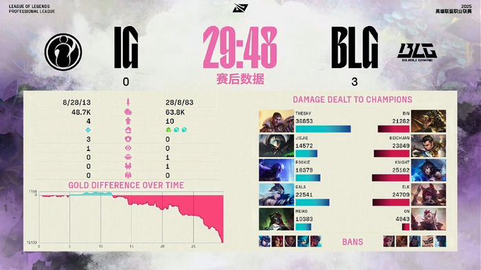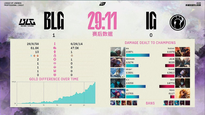 结果第一局比赛,被BLG迅速的打成了速通局。8分钟左右,ON灵性先手控制Elk伤害跟上,GALA塔下失误给出一血;10分钟左右,IG两度越塔,Meiko失误点燃遭到反杀随后Knight被集火击杀;13分钟左右,Beichuan大招失误IG先手开团,BLG中上战斗力拉满打出3换4;18分钟左右,Jiejie河道率先发难,BLG支援及时伤害爆表打出1换3;20分钟左右,BLG进攻性十足强行击杀IG野辅,随后轻松控下厄塔汗;22分钟左右,Bin天肥狼母状态极佳,下路找到机会对位单杀TheShy兰博;最终29分11秒,BLG团灭IG,先赢一局!