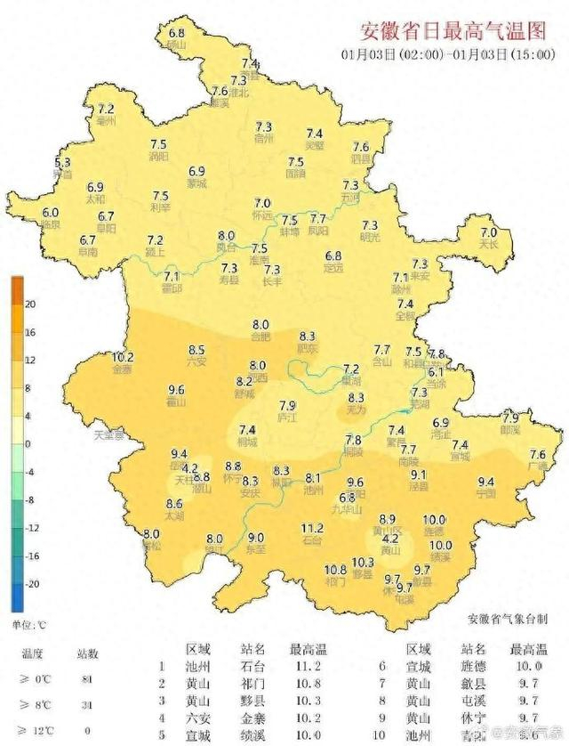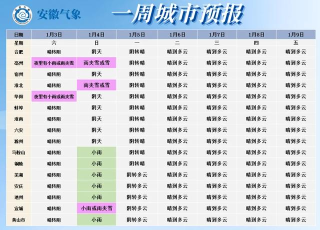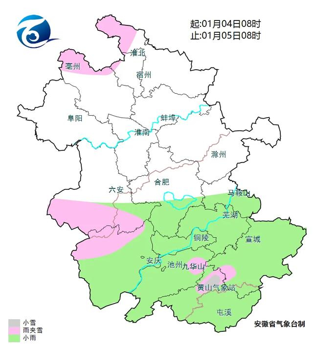 4日(周日):全省阴天。淮河以北北部有雨夹雪或雪;江淮之间南部和江南有小雨,其中大别山区和皖南山区有雨夹雪或雪。