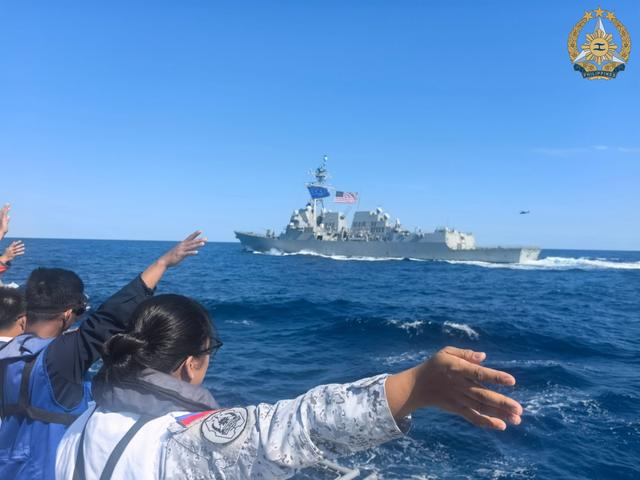 菲军向美军军舰挥手致意
