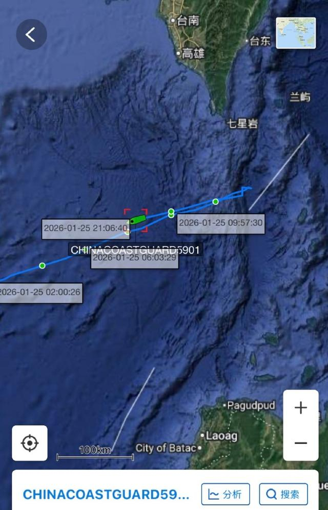 值得一提的是,1月25日至1月26日当天在黄岩岛周边海域对峙斗争态势异常复杂,当天,我海警5901舰和2504舰突然抵达巴士海峡西侧出口和巴丹群岛附近(最近距离巴丹群岛大约40海里),随后在没有通过巴士海峡的情况下突然向西高速行驶,目行驶位置未知。
