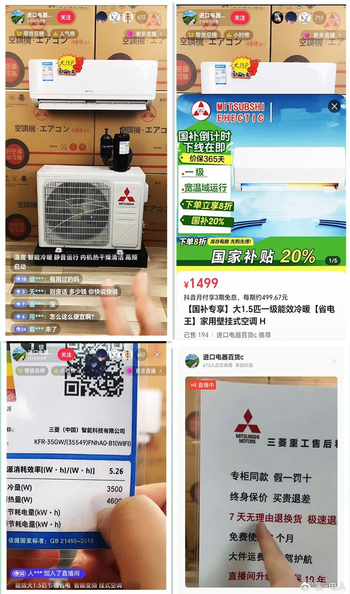 我们走进抖音、快手的家电直播间,发现不少商家打着“三菱”“松下”等知名品牌的旗号,挂羊头卖狗肉,售卖的却是假冒伪劣产品。这些空调价格往往低得离谱,仅是正品价格的零头 。以一款市场上正品价格在5000元左右的三菱空调为例,直播间里竟声称只需1500元就能拿下。如此悬殊的价差,吸引了不少贪图便宜的消费者上当受骗。