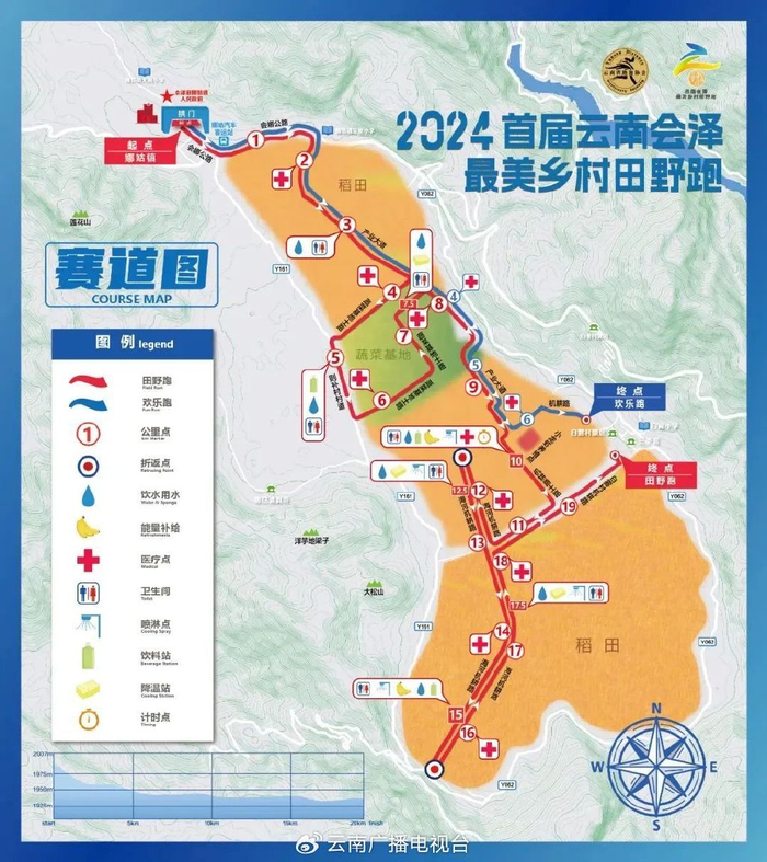 (一)最美乡村田野跑:从娜姑镇集镇出发,沿会娜公路向东→到乐里小学右转向南→沿产业大道至道成公司蔬菜基地路口→右转至蔬菜基地道路(土路)→向东至则补村村道→向南至道成公司蔬菜基地路口→向东进入蔬菜基地道路(土路),转向北再转向东→沿产业大道向南至白雾村机耕路→向西至海河机耕路→向北至机耕路折返点→向南至落水洞高架桥下折返点→向北至白雾村机耕路→向东到达终点。
